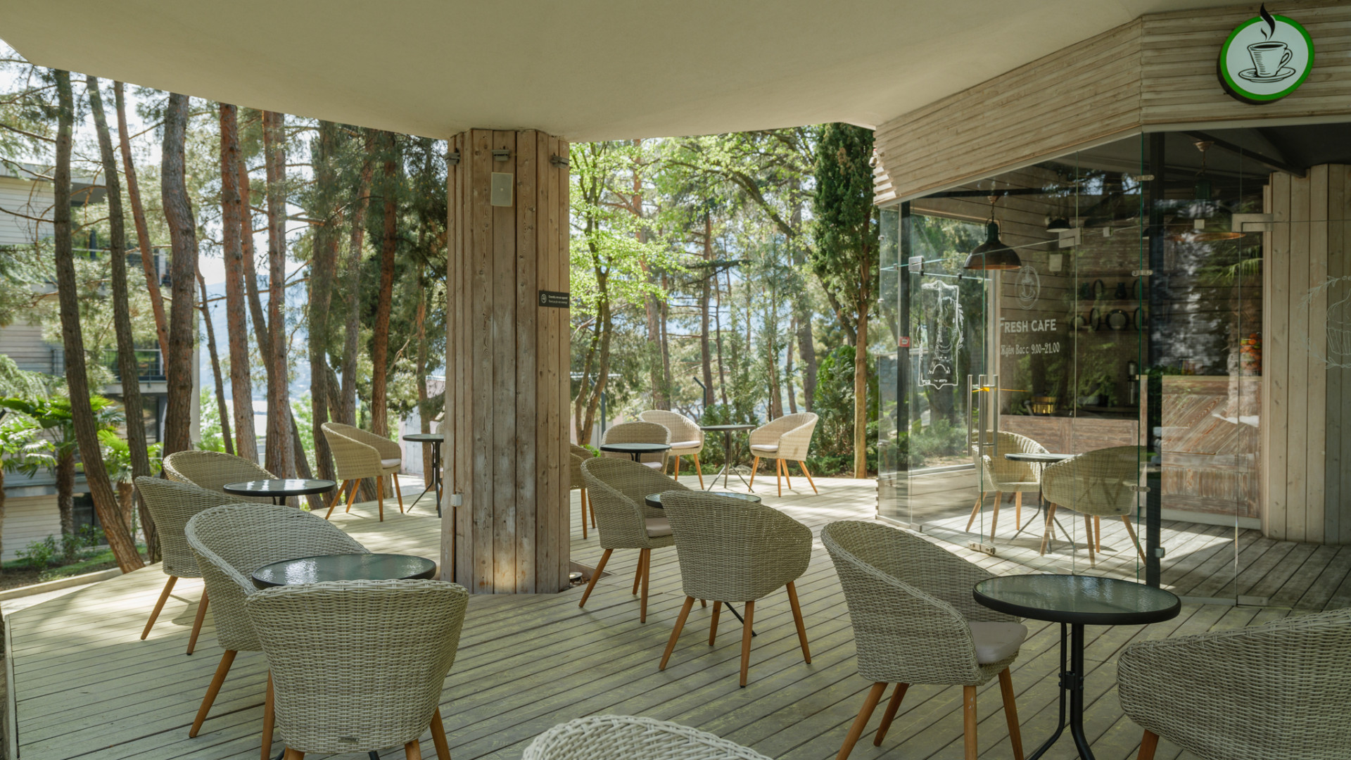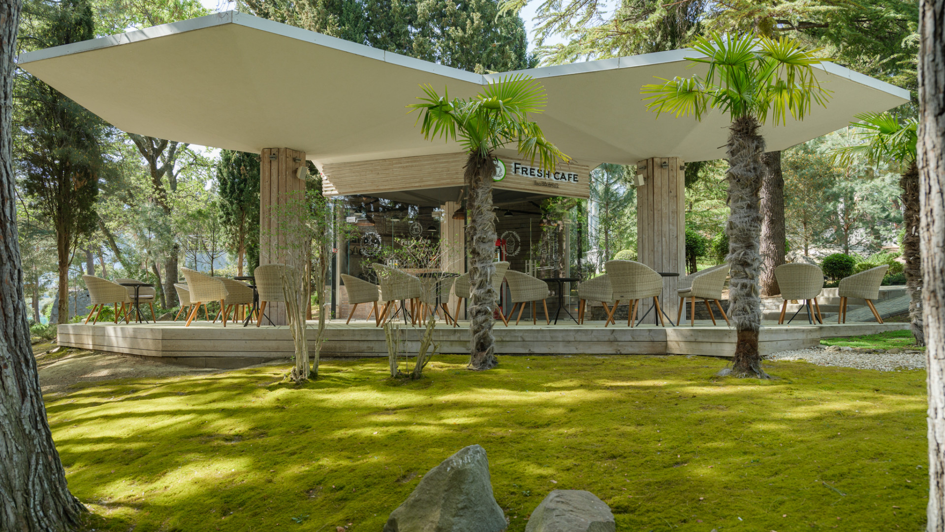 Оно утопает в тени южных вечнозелёных деревьев, где можно насладиться чашечкой кофе с воздушными десертами. Только для вас – кофе по-восточному, нежные бельгийские вафли, широкий выбор чая, мороженого и десертов.